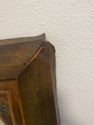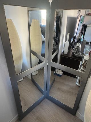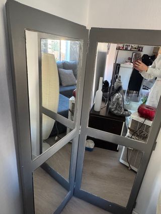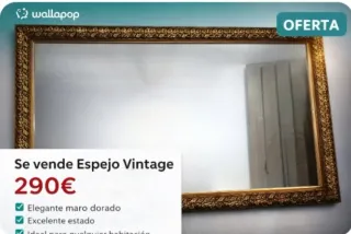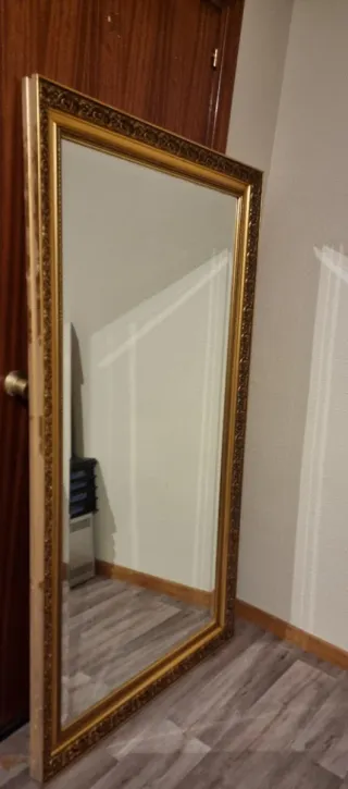 Elegante espejo de estilo vintage con un marco que combina madera y metal. - Marco de madera con detalles en metal dorado. - Diseño rectangular. - Ideal para añadir un toque clásico a cualquier estancia. El espejo no se ha movido de donde está, pero le quiero mover... Es mejor verlo,el espejo está perfecto y es muy grande pero no me gusta el dorado.... Zona Coslada si te interesa y lo quieres ver