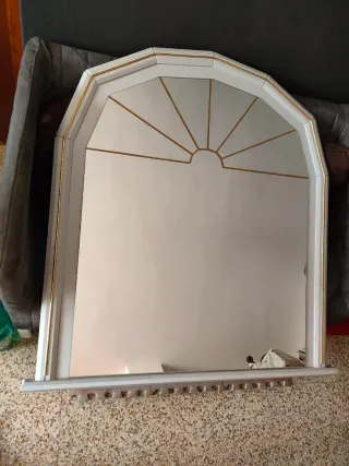 Precioso espejo elegante estilo vintage. Marco de madera con detalles dorados Medidas Altura 107cm Ancho 95cm (El marco de la madera mas abajo que sobresale es de 102 cm) Grosor 4cm Medida solo espejo (sin la madera) 94cm X 78cm Distancia entre los agujeros (anillas para colgar) 77cm (Se pueden cambiar para colocar a diferente distancia entre los clavos) Material Marco de madera Color (marcos y atras) blanco con una línea dorada en el arco. Espejo macizo de alta calidad. Con dibujos de rayas el la parte superior, que le dan un toque único. Ideal para cualquier casa y habitación. Perfecto estado. Precio 50E Telefono 722220202