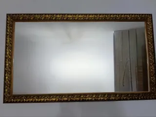 Espejo grande de estilo clásico con marco dorado ricamente ornamentado y copete superior decorativo. Diseño elegante con curvas, ideal para salón, recibidor amplio, dormitorio o decoración clásica/vintage. El marco está en muy buen estado general, con pátina natural del tiempo que le aporta carácter y autenticidad. El cristal se ve bien y el conjunto luce espectacular una vez colgado. Pieza con mucha presencia, difícil de encontrar en este tamaño y estilo, perfecta tanto como elemento decorativo principal como espejo funcional. - Medidas: 135 × 108 cm