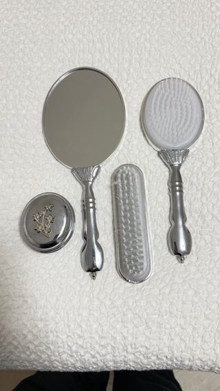Elegante set de tocador con un diseño vintage y detalles florales. - Incluye espejo de mano grande. - Incluye espejo de mano pequeño. - Incluye un estuche ovalado. - Incluye un estuche alargado. - Acabado plateado con detalles en blanco.