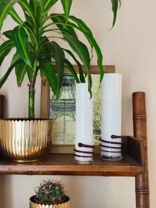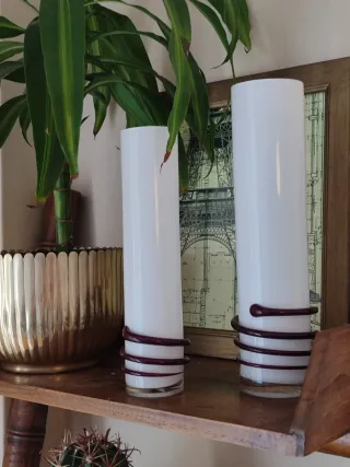 Pareja de jarrones pequeños o violeteros vintage. - Cristal blanco opal. - Hilo de cristal "retorto" en color berenjena. - Procedencia y diseño desconocido. - Libre de fisuras,roturas o desconchados. - 26 cm de altura y 6 cm de diámetro en boca para el grande. - 22,5 cm de altura y 5 cm de diámetro en boca para el pequeño
