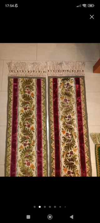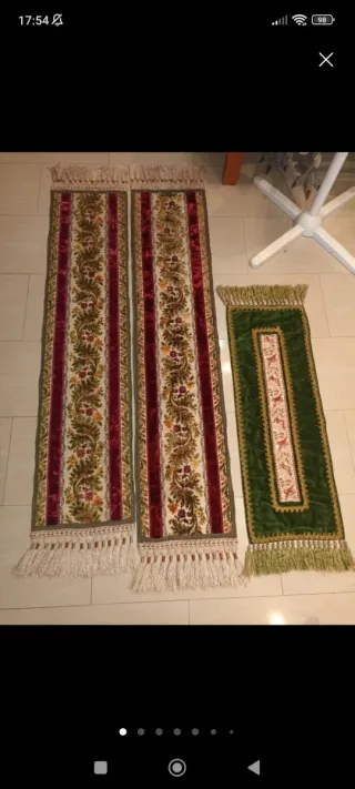 Conjunto de dos tapetes largos y un tapete más pequeño, con un diseño floral clásico. - Diseño floral intrincado. - Bordes con flecos. - Tiras de terciopelo. -quedan los dos grandes,el pequeño está vendido 174x33 y 166x33cm,el precio es por los 2 -caminito de mesa
