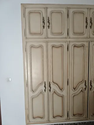 Conjunto de puertas de armario con un estilo vintage y un acabado envejecido. - Diseño clásico con molduras. - Tiradores metálicos decorativos. Medidas : Grandes 157x37'5 Pequeña 57x37'5
