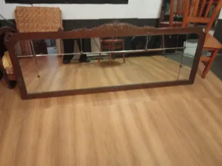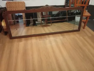Espejo grande con marco de madera maciza, estilo clásico y elegante. En muy buen estado, Aporta amplitud y luminosidad al espacio. Listo para colgar. Antigüedad/Antique/Vintage Medidas totales del espejo incluyendo el marco, ojo!! Parte mas ancha de la moldura Ancho 230.50cm De lado a lado del marco de madera Ancho 218cm Alto 103cm Fondo 4cm (Medidas del espejo solo 202x81cm) **Se puede ver sin compromiso en FUENGIROLA. No hago devoluciones. Pago en efectivo*** #madera #carpinteria #decoracion #attrezzo #cortijo #casadecampo #antiguedad #vintage #rustico