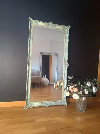 Elegante espejo vintage de gran tamaño con un marco de madera tallada y detalles ornamentales. Su diseño aporta un toque clásico y sofisticado a cualquier espacio. - Marco de madera con acabados detallados. - Panel trasero de color verde.