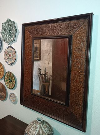 Espejo de pared rectangular artesanal con marco ancho en cuero, repujado con relieves ornamentales continuos en los cuatro lados, ligeramente policromados. Marco exterior también en cuero, en marrón más oscuro. Hecho a mano. El cristal lleva de origen una pátina para darle aire envejecido. Medidas: 88 × 70 cm No envío. Recoger en El Coto