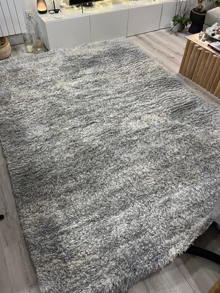 Preciosa alfombra de salón de gran tamaño. Aporta calidez y diseño a tu hogar. - Medidas: 200 x 290 cm. - Textura suave y mullida. - Diseño moderno y versátil. Marca: FestivAl • Medidas: 200 x 290 cm (grande) • Material: 100% poliéster • Color: gris jaspeado • Estado: muy buen estado . Solo se ha usado un año Precio nueva 300€