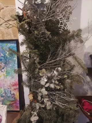Precioso árbol de Navidad listo para dar ambiente festivo a tu hogar. Incluye adornos y luces. - Adornos de cristal y plástico. - Decoración en tonos plateados y verdes.