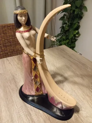 Elegante figura de porcelana inspirada en el antiguo Egipto. Representa a una mujer tocando el arpa, con detalles dorados y rosados. Figura grande y muy bien cuidada. - Diseño detallado. - Base negra. - Estilo Art Déco. Precio a convenir.