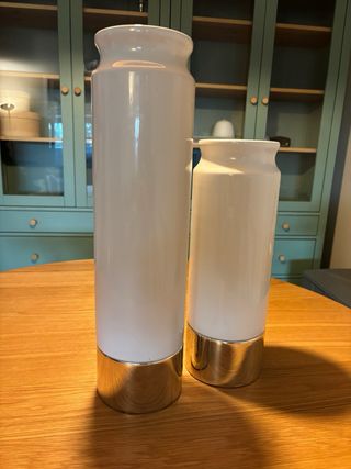 Elegante jarrón de cerámica. Su diseño moderno aportará un toque sofisticado a tu hogar. - Base metálica con acabado plateado. - Cuerpo principal en cerámica blanca. Grande: 13x49cm Pequeño: 13x38cm