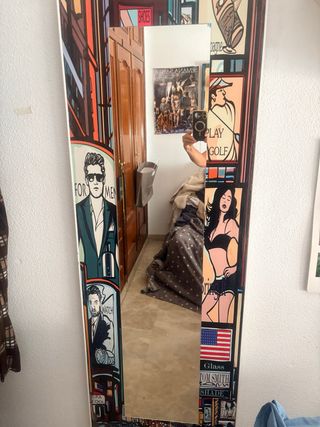 Este espejo grande y moderno es una pieza llamativa para cualquier hogar. Su diseño único añade un toque artístico a tu espacio. - Marco con diseño gráfico multicolor. - Tamaño grande para un impacto visual. - Combina elementos de diseño retro y contemporáneo.