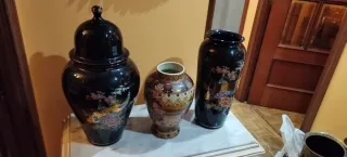 Elegante conjunto de tres jarrones de estilo oriental, perfectos para añadir un toque de distinción a tu hogar. - Jarrón grande con tapa. - Jarrón mediano decorado. - Jarrón alto con motivos florales. Juntos, 25 euros. Por separado, 10 euros cada uno.