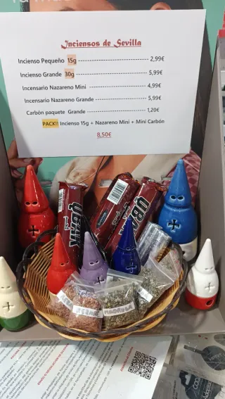 Variedad de inciensos y accesorios de Sevilla a buen precio. - Incienso Pequeño 15g - Incienso Grande 30g - Incensario Nazareno Mini - Incensario Nazareno Grande - Carbón paquete Grande - Pack: Incienso 15g + Nazareno Mini + Mini Carbón