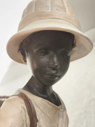 Figura decorativa de un porteador africano vestido con su atuendo tradicional y un cesto a la espalda. Medidas porteador: alto 43 x ancho 22 Peana: 14 x 14 Cesto: 15,50 x 10 x 17 formato irregular ya que es un cesto. Peso: + 2 Kg Bonita pieza con un gran tamaño ideal para decorar una estancia grande, colocar sobre una mesa de centro, mostrador de hotel, casa rural, entorno étnico, poner flores secas en el cesto, etc. Si te gusta este tipo de decoración este porteador hará las delicias de tus visitas. Está muy logrado y como nuevo ya que forma parte de cierre de tienda local. Hago envíos.