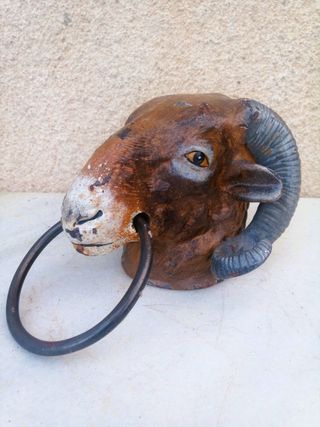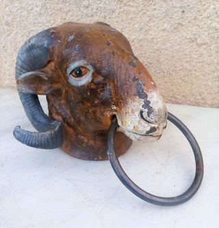 Antigua figura de carnero realizada en hierro fundido con argolla de acero, grande y fuerte, mide 22 x 16 y pesa 2,6kg de peso, el hierro fundido representa fielmente todos los detalles, la pintura es original con signos de oxido adquirido por el paso del tiempo, por su tamaño se pueden utilizar como toallero o aldaba en ambientes rurales o establos. 🎁Mas artículos y antigüedades en mi perfil. 📱Acepto pago bizum. ⛔Argolla, amarre, aldaba, toallero, perchero.