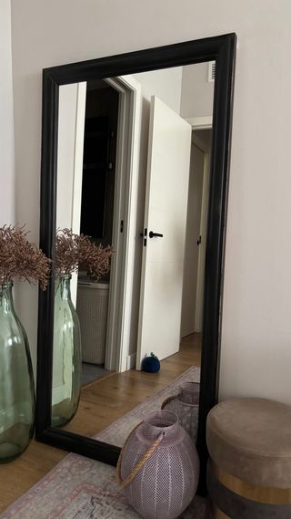 Elegante espejo de pie con un marco de madera que añade un toque de calidez a cualquier espacio. - Marco de madera robusto. - Diseño alto y estilizado. Costo 260€ hace menos de un año.