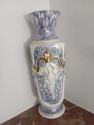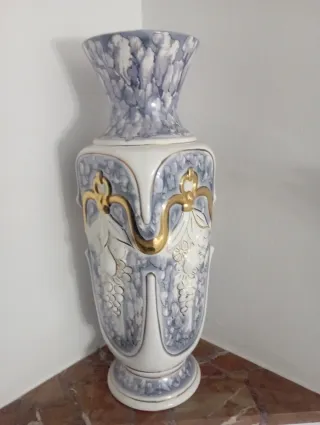 Elegante jarrón de cerámica con un diseño llamativo. Medidas 60 cm alto y ancho 20 cm - Acabado en tonos azules y blancos. - Detalles dorados. - Motivos de uvas y hojas. - Base y cuello ornamentados.