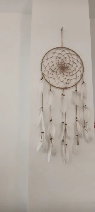 Este atrapasueños grande está hecho a mano con un diseño tejido. - Aro principal con cuerda de yute. - Cuelgan tiras con plumas blancas y cuentas. - Decoración bohemia para el hogar.