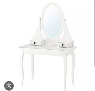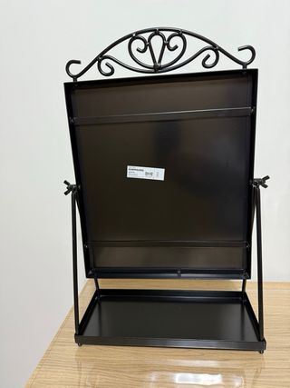 Espejo/tocador de la marca Ikea prácticamente nuevo, color negro y con decoración en la parte superior. Es rotatorio y se puede ajustar para que se quede fijo si se prefiere. Tiene también una bandeja para almacenar maquillaje u otros utensilios y se puede transportar con facilidad.