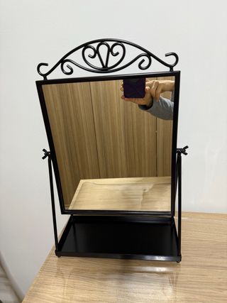 Elegante espejo de mesa con un diseño clásico y un acabado cuidado. Perfecto para añadir un toque de estilo a cualquier tocador o escritorio. - Marco metálico con detalles ornamentales. - Base de madera para mayor estabilidad. - Bandeja inferior para organizar pequeños objetos.