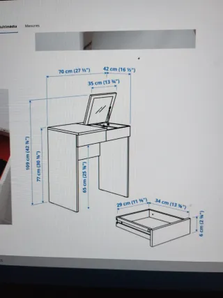 Tocador de diseño moderno con espejo abatible y compartimentos de almacenamiento ocultos. - Tapa con bisagras. - Compartimentos de almacenamiento integrados. Lo tengo montaro en trastero de Mataró x no poder usarlo (no tengo sitio). Si vienes con furgoneta te lo puedes llevar perfectamente montado. Ver medidas en foto.