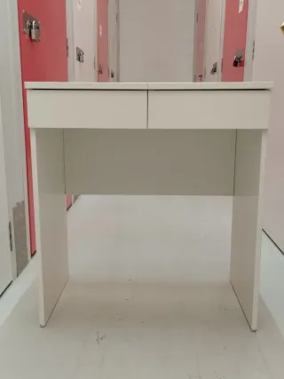 Elegante tocador de Ikea con un diseño clásico y funcional. Perfecto para tu espacio de belleza. - Acabado en blanco. - Incluye espejo ovalado. - Cuenta con dos cajones pequeños.