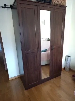 Armario de madera de dos puertas con espejo en el centro - Acabado en tono marrón oscuro Tiradores metálicos en negro Se vende desmontado
