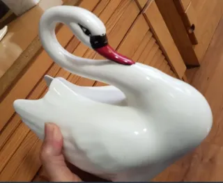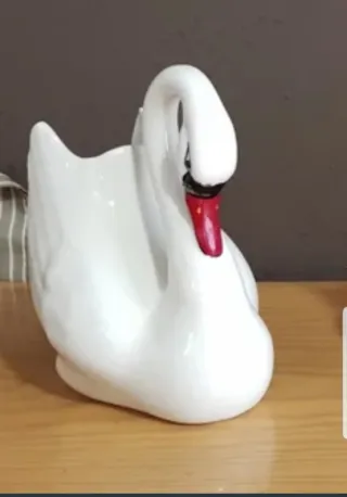 Figura decorativa de cisne en porcelana. - Diseño elegante en blanco. - Detalle en el pico en color rojo. -Obertura central para flores,como joyero, u otros usos. -Mide 19cm de alto y 20 de fondo. No hago envíos con GLS,gracias.