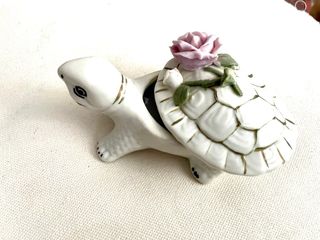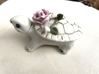 Preciosa caja joyero con forma de tortuga. Es de cerámica y porcelana, con delicados detalles. - Ideal para guardar anillos, pendientes u otras joyas pequeñas. - Presenta un diseño encantador y elegante. - Perfecta como regalo o para uso personal.