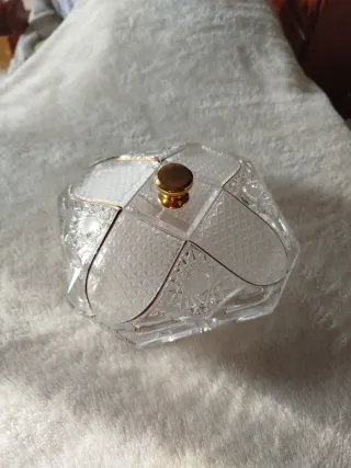 Elegante bombonera o joyero con un diseño facetado y detalles dorados. - Cuerpo principal de cristal tallado. - Tapa con pomo metálico dorado. - Ribetes dorados decorativos.