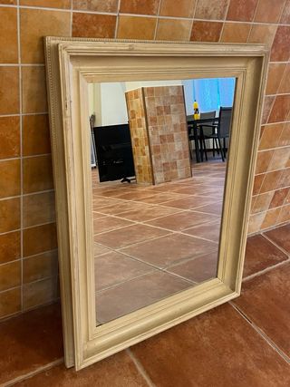 Elegante espejo con marco de madera y detalles decorativos. es de madera color crema, se puede colgar vertical o horizontal , tiene varios ganchos detrás para colgarlo de diferente forma . muy bonito , como nuevo !!! - Marco con acabado texturizado. - Diseño clásico y versátil.