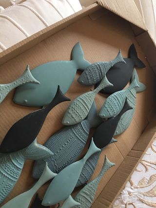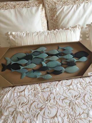 Decoración de pared con peces de metal de Maison du Monde. Añade un toque náutico a tu hogar. mide 74 x 28 cm - Diseño de peces en cardumen. - Combinación de colores negro y teal. - Material metálico duradero.