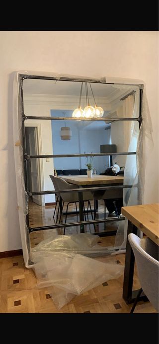 Elegante espejo de gran tamaño con un diseño inspirado en ventanas industriales. Aporta profundidad y luminosidad a cualquier estancia. Modelo Denys. Las medidas se encuentran en la segunda foto. Tiene 5 an̈os pero esta en muy buen estado. - Marco de madera con detalles metálicos negros. - Múltiples divisiones que simulan paneles de ventana.
