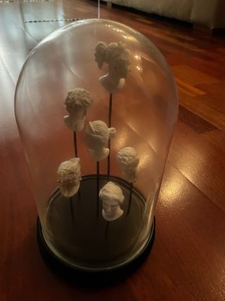Figura decorativa de cabezas clásicas bajo campana de cristal. - Diseño elegante y atemporal. - Base negra. - Ideal para cualquier estancia.