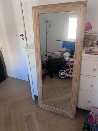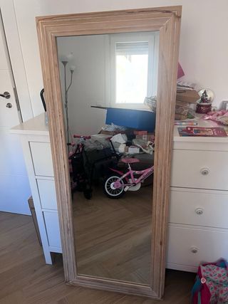 Elegante espejo de pie con marco de madera. - Medidas: 59 cm de ancho x 145 cm de alto. - Acabado en madera natural. -tiene una mancha como se ve en la imagen por eso precio reducido
