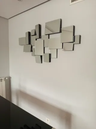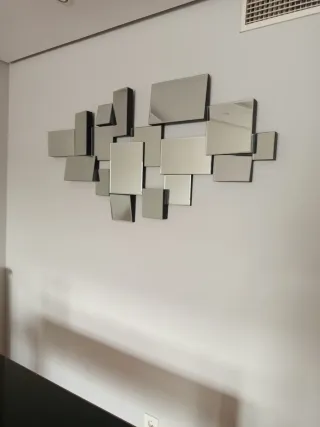 Elegante espejo de pared con un diseño moderno. - Marco con acabado en negro y plateado. - Múltiples secciones de espejo. - Estructura metálica robusta.
