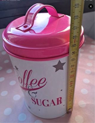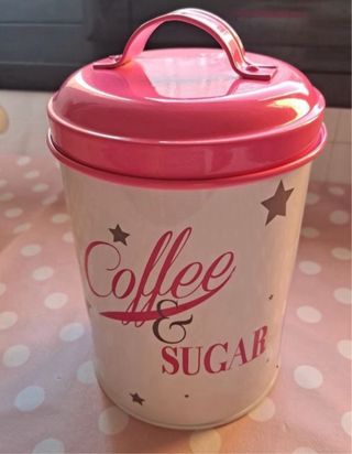 Precioso bote para café y azúcar de metal de la marca Maisons du Monde. Es nuevo y está en perfectas condiciones. - Diseño elegante con estrellas y texto "Coffee & Sugar". - Tapa de color rosa. - Asa para facilitar su transporte. - Ideal para guardar café o azúcar en la cocina. - Medidas en las fotos - PRECIO NO NEGOCIABLE