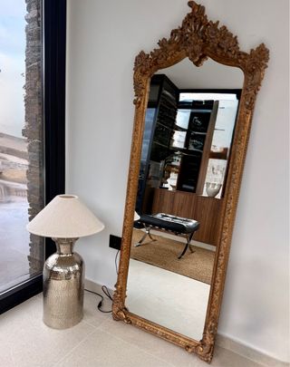 Elegante espejo de pie con un marco ornamentado. - Diseño barroco. - Acabado dorado.