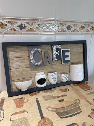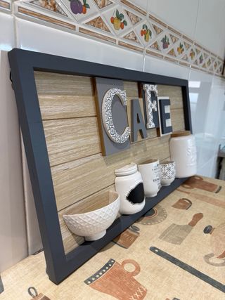 Precioso cuadro decorativo con la palabra CAFE, perfecto para dar un toque especial a tu cocina o comedor. - Diseño moderno con letras en relieve. - Marco de madera con acabado rústico. - Incluye pequeños accesorios decorativos como un cuenco, tarros y tazas.
