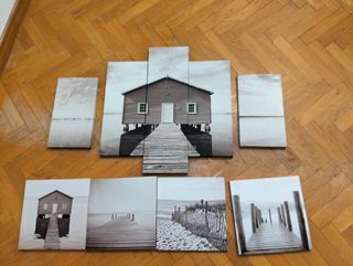 Preciosos cuadros de Maison du Monde. Tres cuadros con motivos florales en blanco y gris sobre fondo madera y un conjunto de cinco cuadros con una bonita imagen de una casa junto al mar. Todos en perfecto estado. - Tres cuadros con flores - Cinco cuadros con imagen de casa en la playa, tríptico flores para dormitorio y colección Paris. Se venden juntos o separados. Colección playa, 20 euros y el resto, 10 cada colección. Todos 40.