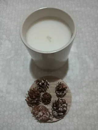 Vela aromática decorada con piñas decorativa - Base de cerámica blanca. - Tapa de madera. - Decoración con piñas y detalles blanco Nueva a estrenar de Maison du Monde.