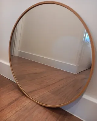 Elegante espejo redondo con marco de madera. - Marco de madera natural. - Cristal de espejo. - Combina con cualquier decoración. Incluye mueble de Ikea de organizacion se vende por separado tambien medidas 77 ancho 39 fondo 76 alto