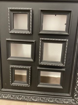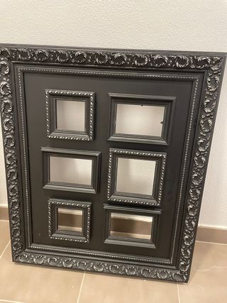 Marco negro para 6 fotos de distintos tamaños con anclaje en su parte posterior para colgar tanto para horizontal como vertical. sin el soporte de las fotos. Estiloso y vintage a la par. Resistente y duradero de buenos materiales Medidas: 75 x 64 x 4