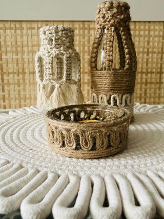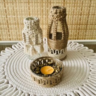 3 adornos de decoracion boho hechos a mano con tecnica macrame. Son dos floreros y un portavelas. Unicos, no hay dos iguales ya que son completamente artesanales, de cristal reciclado, yute y algodón. El portavelas incluye la vela de te y las piedras doradas. Encontraras este estilo en sklum, westwing, zara home, maison du monde, a loja do gato preto, etc... pero no como estos, llevan horas de trabajo.