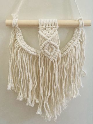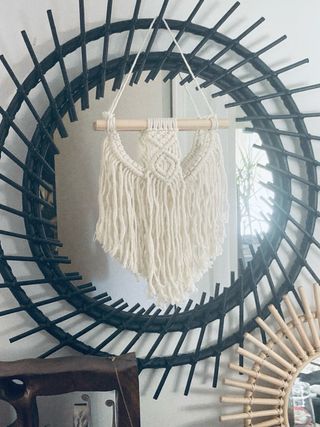Precioso colgador tejido a mano con técnica macramé. Ideal para darle un toque boho a tu hogar, para colgar de la pared, cabecero o donde se te ocurra. Con cuerda para colgarlo facilmente. - Confeccionado con hilo de algodón de color crudo. - Diseño con flecos y patrón geométrico. - Con barra de madera natural. - Perfecto para decorar cualquier rincon de tu hogar, no apto para exterior ya que los materiales se estropearian con las inclemencias del tiempo ( sol, lluvias, ... ) Encontraras este estilo en sklum, westwing, zara home, maison du monde, a loja do gato preto, etc... Cambio por cosas de bebe que necesite.