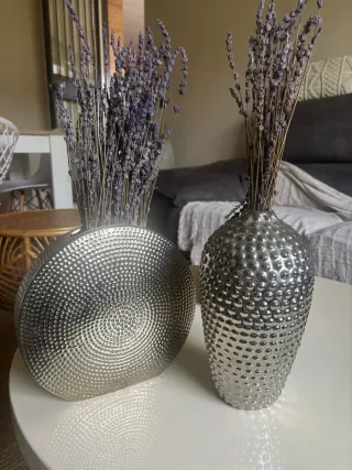 Conjunto de dos jarrones decorativos con un diseño texturizado. Acabado plateado brillante. Diseño con relieve de puntos. Se venden juntos o por separado. Los dos: 20€ Redondo: 10€ Alargado: 10€