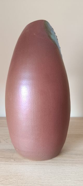 Elegante jarrón decorativo con un diseño vintage y un acabado esmaltado único. Su forma ovalada y la combinación de colores lo convierten en una pieza llamativa. - Diseño esmaltado con detalles texturizados. Y pintados en plateado - Tonos burdeos y plateados iridiscentes.