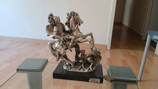 Figura decorativa de San Jorge luchando contra el dragón. - Baño de plata de ley. - Base de mármol.
