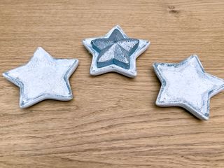 Bonita vela decorativa con forma de estrella. Presenta un diseño elegante en dos tonos. - Base en forma de estrella blanca. - Vela superior en forma de estrella plateada. - Detalles brillantes en la base. La altura es la suma de todas las piezas, una encima de otra.