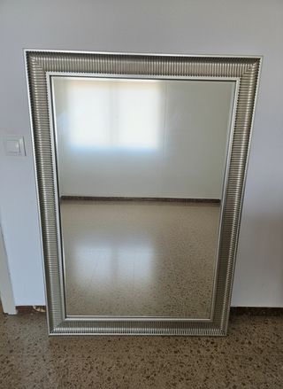 Elegante espejo con un marco plateado con efecto envejecido. Perfecto para añadir un toque de estilo a cualquier habitación. Se puede mover los ganchos y colgarlo en horizontal también. Recogida en centro de Barcelona (planta baja).